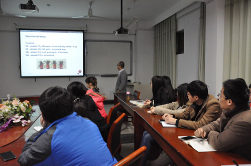 报告开始,主持人王笑老师对Fulai Liu副教授的到来表达了热烈的欢迎,紧接着对他的工作和科研做了简单的介绍。Fulai Liu 副教授于2000年获德国汉诺威大学园艺科学系农学硕士,2004年获得丹麦皇家兽医农业大学农学博士。1996-1998年在中国农业科学院土壤与肥料研究所担任助理研究员,2000-2001年在德国汉诺威大学园艺科学系担任研究助理。2004年起在丹麦哥本哈根大学任助理教授、副教授。Fulai Liu 主要在作物逆境生理及特别在干旱胁迫诱导的根源化学信号对作物营养与生殖发育的调控、作物响应气候变化等领域开展研究、碳水化合物代谢及水分利用效率的影响等方面进行了系统的研究。Fulai Liu 作为主要研究人员主持或参加欧盟合作项目、丹麦科学研究基金会项目十余项,是丹麦哥本哈根大学博士学位委员会主席、吉林大学兼职教授、八叉书库 客座教授、中科院东北农林研究院兼职研究员。Fulai Liu博士还是中丹联合大学(丹麦政府与中国科学院合作办学,以联合培养两国研究生为主)的协调人和主要负责人。