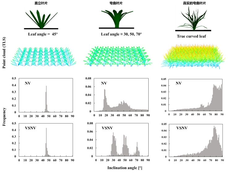 图2在三种叶角分布模式(直立叶片、弯曲叶片和真实的弯曲叶片)下基于VSNV和NV二种方法估算的LAD结果对比