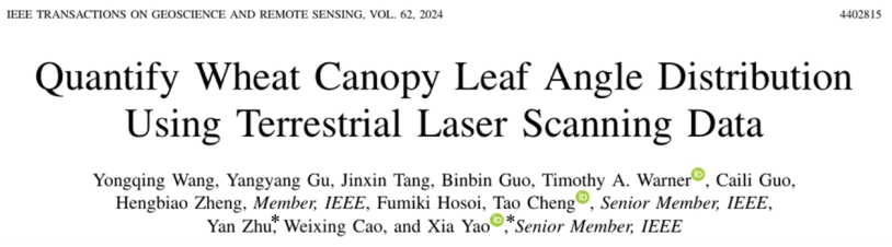 《IEEE Transactions on Geoscience and Remote Sensing》发表智慧农业团队“Quantify Wheat Canopy Leaf Angle Distribution Using Terrestrial Laser Scanning Data”