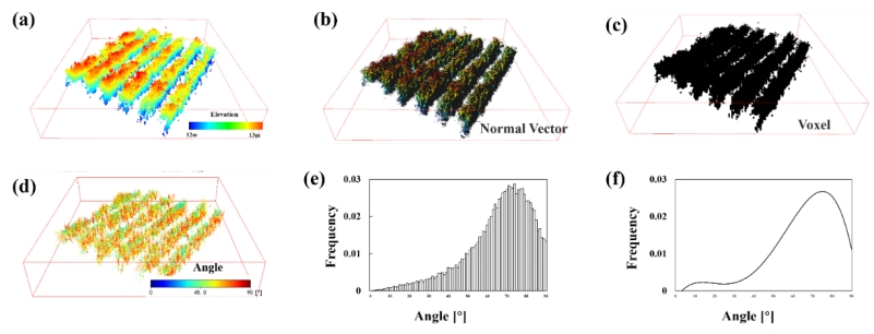 (a)小麦冠层点云(b)计算法向量(c)点云体素化后的体素立方体(d)体素角度(e)体素角度分布频率(f)四项式拟合体素角度后获得的LAD