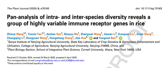《The Plant Journal》发表鲍永美教授课题组“Pan-analysis of intra- and inter-species diversity reveals a group of highly variable immune receptor genes in rice”