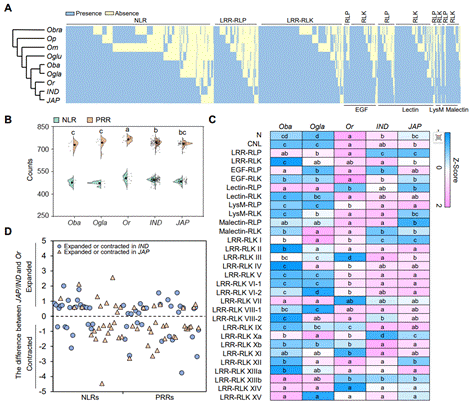 植物依赖两类不同类型免疫受体激活抗性反应:胞内核苷酸结合/富亮氨酸重复序列(NLR)和细胞表面模式识别受体(PRR)。其中,PRR又分为受体样蛋白(RLP)和受体样激酶(RLK)。研究团队对栽培稻及其野生近缘物种的高质量基因组进行分析,共鉴定到149,592个NLR和226,718个PRR类免疫受体编码基因。Shannon多样性分析显示PRR亚群LRR-RLP和NLR类免疫受体的氨基酸序列多态性最高,并鉴定到大量野生稻中特有的抗病基因和新等位变异。基于转录组数据分析,进一步解析了水稻抗病基因的组织特异性表达谱。同时,研究揭示了水稻基因组中抗病基因数目的扩张受到环境非生物因子的影响。这些发现不仅为理解水稻免疫受体的进化提供了新的见解,还为培育水稻抗病新品种提供了潜在的基因资源。