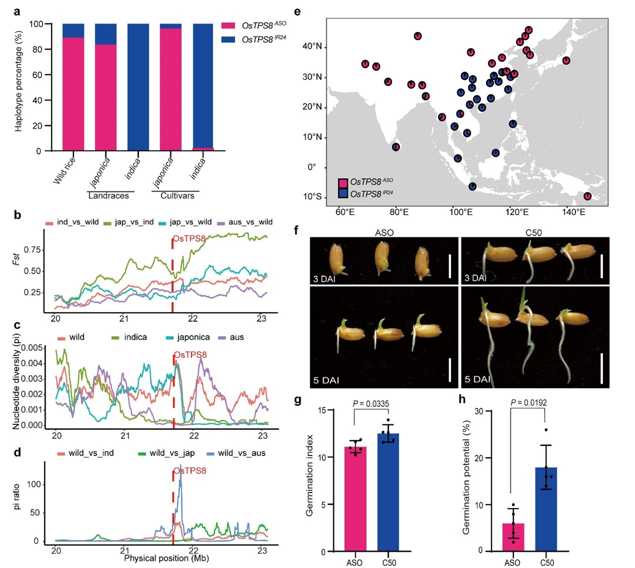 研究团队在OsTPS8启动子区鉴定到一个功能性SNP自然变异,影响了转录因子OsbHLH001对其的结合能力,从而造成OsTPS8在籼稻与粳稻中表达水平的差异。根据该自然变异,研究人员将OsTPS8划分为OsTPS8ASO和OsTPS8IR24两种单倍型,粳稻中保留了与野生稻一致的OsTPS8ASO单倍型,而OsTPS8IR24单倍型则在籼稻驯化过程中被优先选择。研究发现携带OsTPS8IR24单倍型的种子(主要是籼稻)α-淀粉酶活性高萌发快,这可能是OsTPS8IR24单倍型在籼稻中被驯化选择的动力。