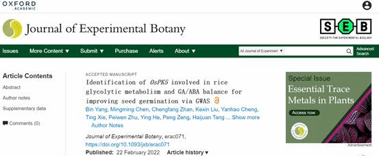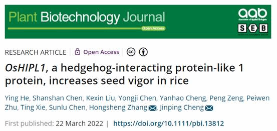 《Plant Biotechnology Journal》、《Journal of Experimental Botany》分别发表张红生课题组“OsHIPL1, a hedgehog-interacting protein-like 1 protein, increases seed vigor in rice”和“Identification of OsPK5 involved in rice glycolytic metabolism and GA/ABA balance for improving