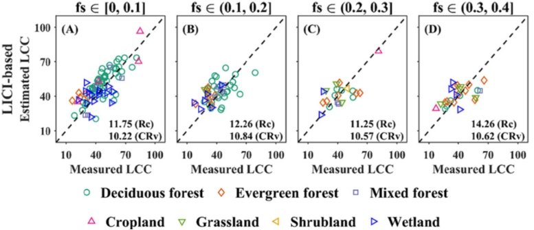 不同土壤覆盖度条件下应用3SV算法前后LCC估算性能比较:(A)0-0.1、(B)0.1-0.2、(C)0.2-0.3、(D)0.3-0.4