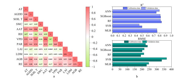 图1 麦田RE与地面因子之间的相关性(a)与基于地面因子建立的机器学习模型估测RE的能力(b)