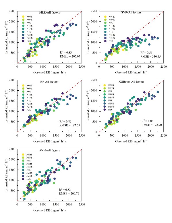 进一步采用Lloyd和Taylor模型结合土壤含水量和代表植株生产力的遥感指标建立了9个改进模型。结果表明,LT1-NIRV模型的预测精度最好,R2达到0.60-0.64,RMSE达到285.98-316.19 mg m-2h-1(图3)。为了探究多源信息用于构建RE估测模型的潜力,5个机器学习模型(MLR、SVR、RF、XGBoost、ANN)被用于估测RE的变化,其中以基于XGBoost的模型的估测精度表现最佳(图4)。本研究构建的机器学习模型能可靠地利用高分辨率无人机多光谱影像和农田环境因素来估测麦田RE的变化,并为RE的升尺度观测提供技术支撑。