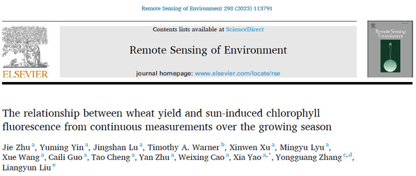 《Remote Sensing ofEnvironment》发表智慧农业团队“The relationship between wheat yield and sun-induced chlorophyll fluorescence from continuous measurements over the growing season”