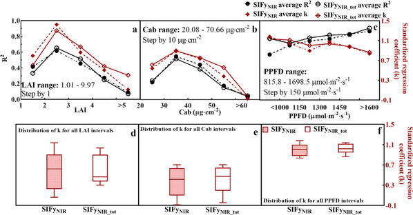 SIFyNIR-小麦产量模型和SIFyNIR_tot-小麦产量模型在每个关键生育阶段不同LAI(a)、Cab(b)和PPFD(c)区间的平均R2(左Y轴)和平均标准化回归系数(k)(右Y轴);SIFyNIR-小麦产量模型和SIFyNIR_tot-小麦产量模型不同LAI(d)、Cab(e)和PPFD(f)区间内k变异范围的箱线图