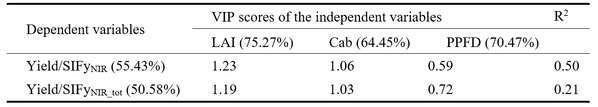 表1 偏最小二乘回归(PLSR)模型中影响因变量(yield/SIFypNIR或yield/SIFypNIR_tot的PC1)的因素(自变量的PC1:LAI、Cab和PAR)的变量投影重要性(VIP)得分