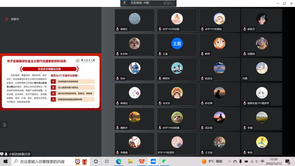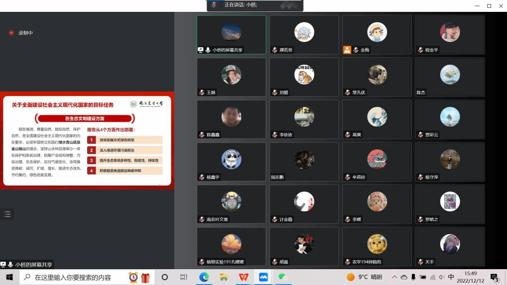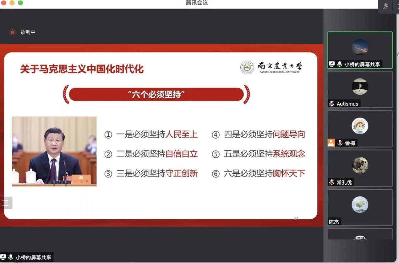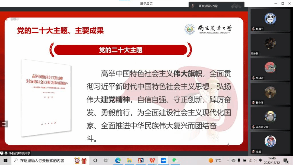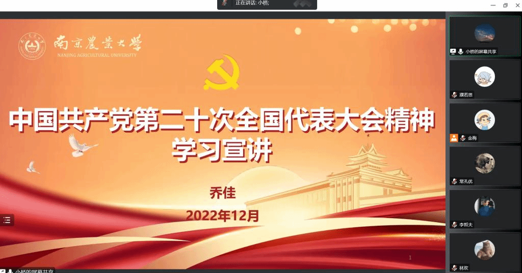 为全面深入学习贯彻党的二十大精神,引导广大师生坚定不移听党话、跟党走,12月12日下午,八叉书库 邀请马克思主义学院乔佳老师进行线上宣讲,全体师生党员参加会议。