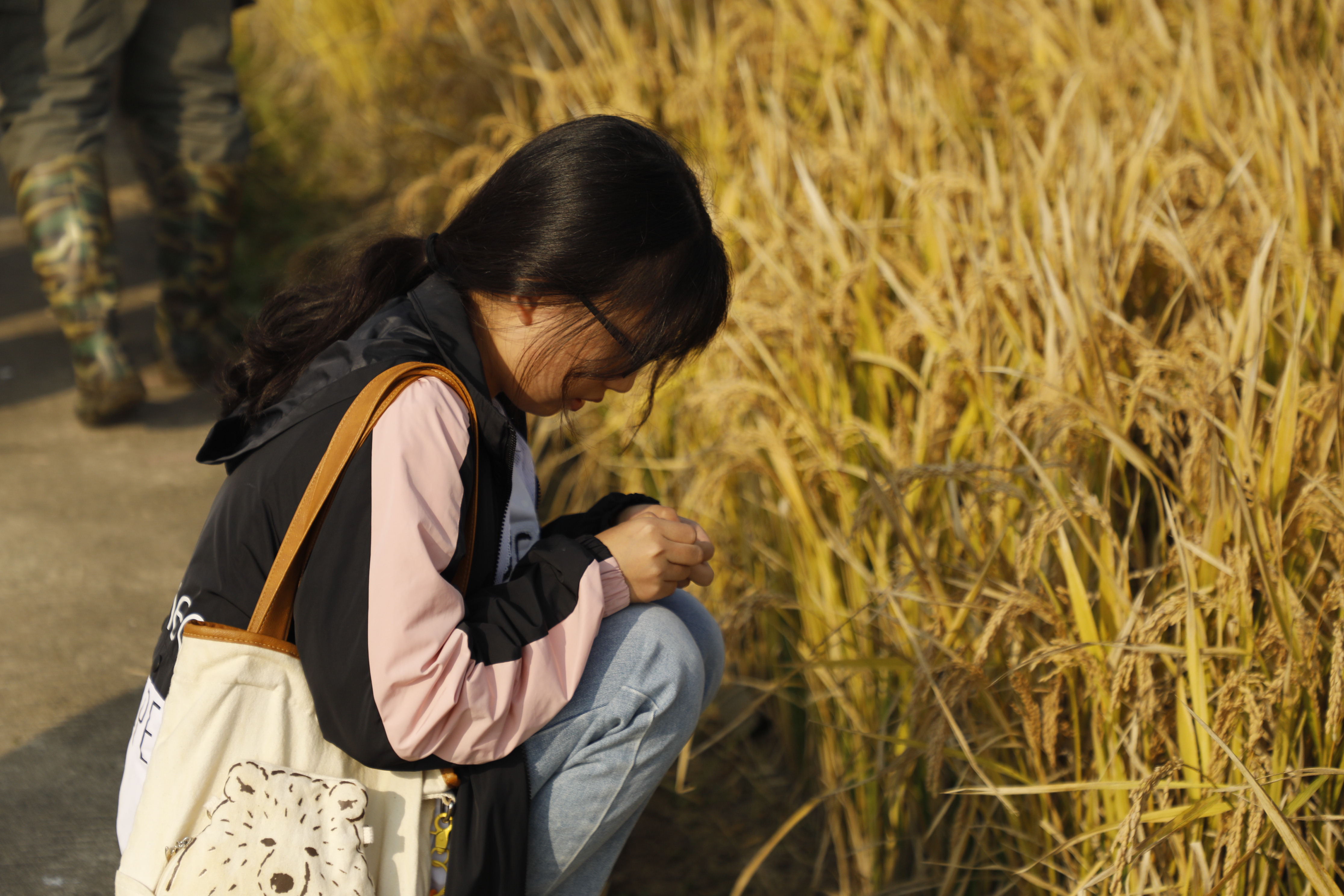 八叉书库 土桥试验基地是八叉书库 作物遗传与种质创新国家重点实验室和农业农村部长江中下游粳稻生物学与遗传育种重点实验室的水稻育种基地,也是南京水稻种质资源国家野外科学观测研究站的落地点。学生们到达土桥基地后,大片大片金黄稻田映入眼帘。这城市中难得一见的辽阔丰收景象与明艳色彩,勾起了同学们满满的热情与好奇。大家纷纷拿起手机拍照记录,还有做过功课的同学指着田间一个竖了标牌的田块喜道:“看!宁香粳9号,这个品种好耳熟啊,好像是得过全国品鉴会金奖的品种吧!”。
