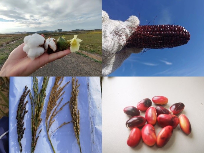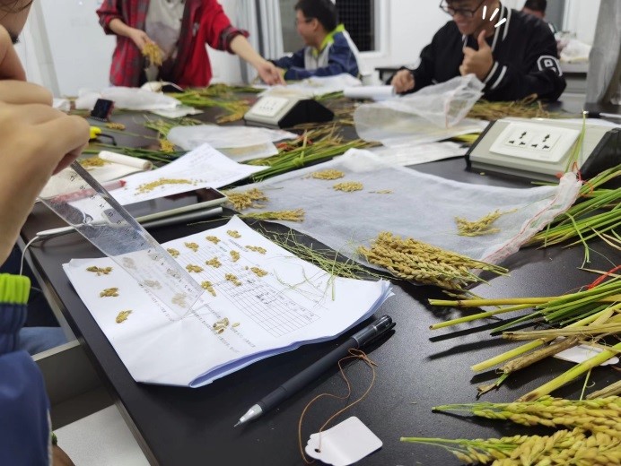 到达基地后的同学们先是有序完成入住,后经短暂的休息,很快便投入了实习课程。实习分为育种和栽培两大部分,分别针对水稻、玉米、大豆、棉花四个作物进行作物成熟期测产、性状考察、室内考种、选种等操作的训练。白天,同学们各自分工,组成不同的小组,在田间有序地进行各项测量工作;晚上,同学们则将自己白天收集到的数据汇总到一起,进行品种比较或产量计算。虽然天公不作美,在实习的最后几天,基地遭遇了连续降雨,但是同学们并没有因此懈怠,依旧按时前往教室,进行理论知识的学习或是室内考种工作,还有的班级趁着雨势较小,抢着时间去田间收回一些作物继续进行室内考种工作。