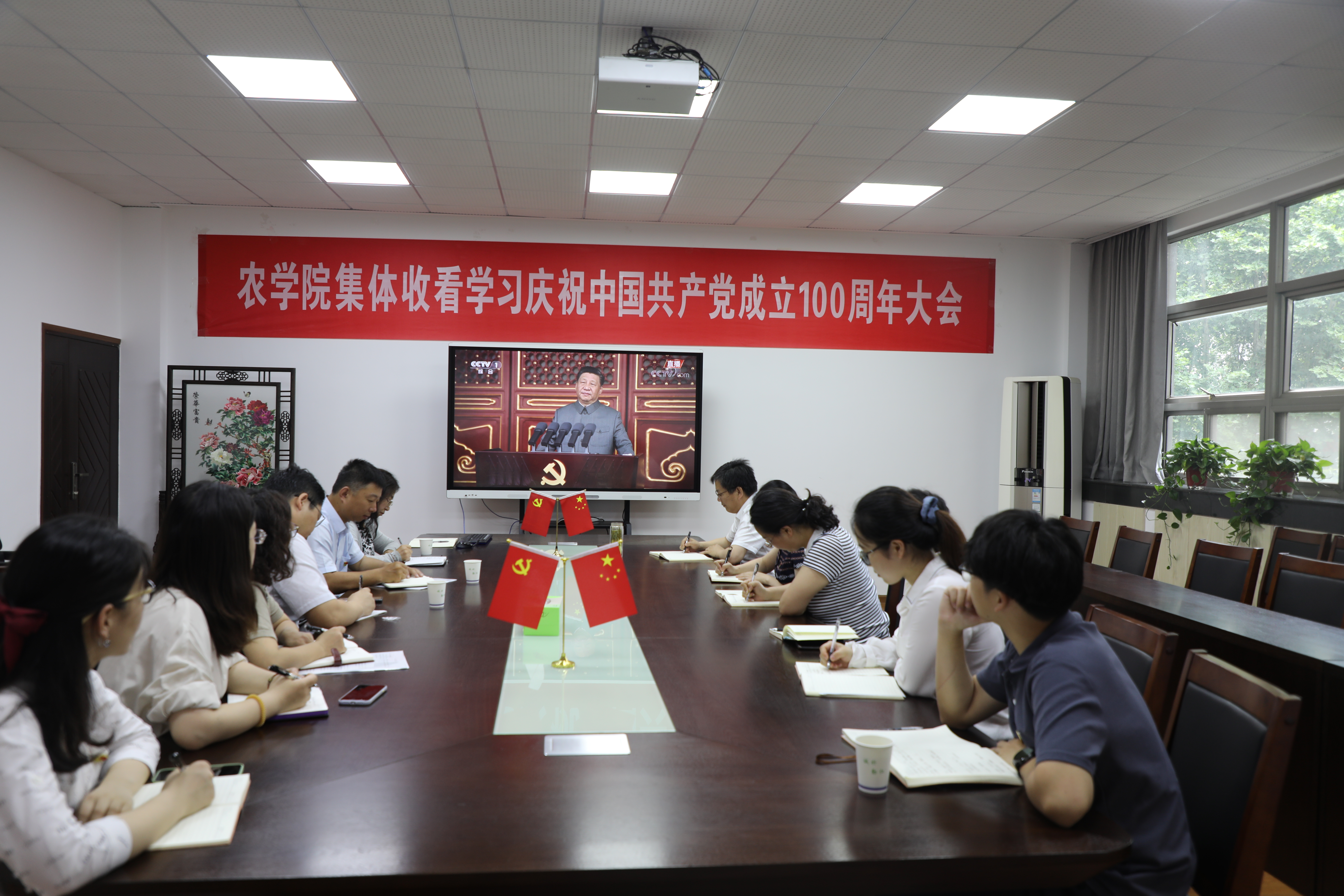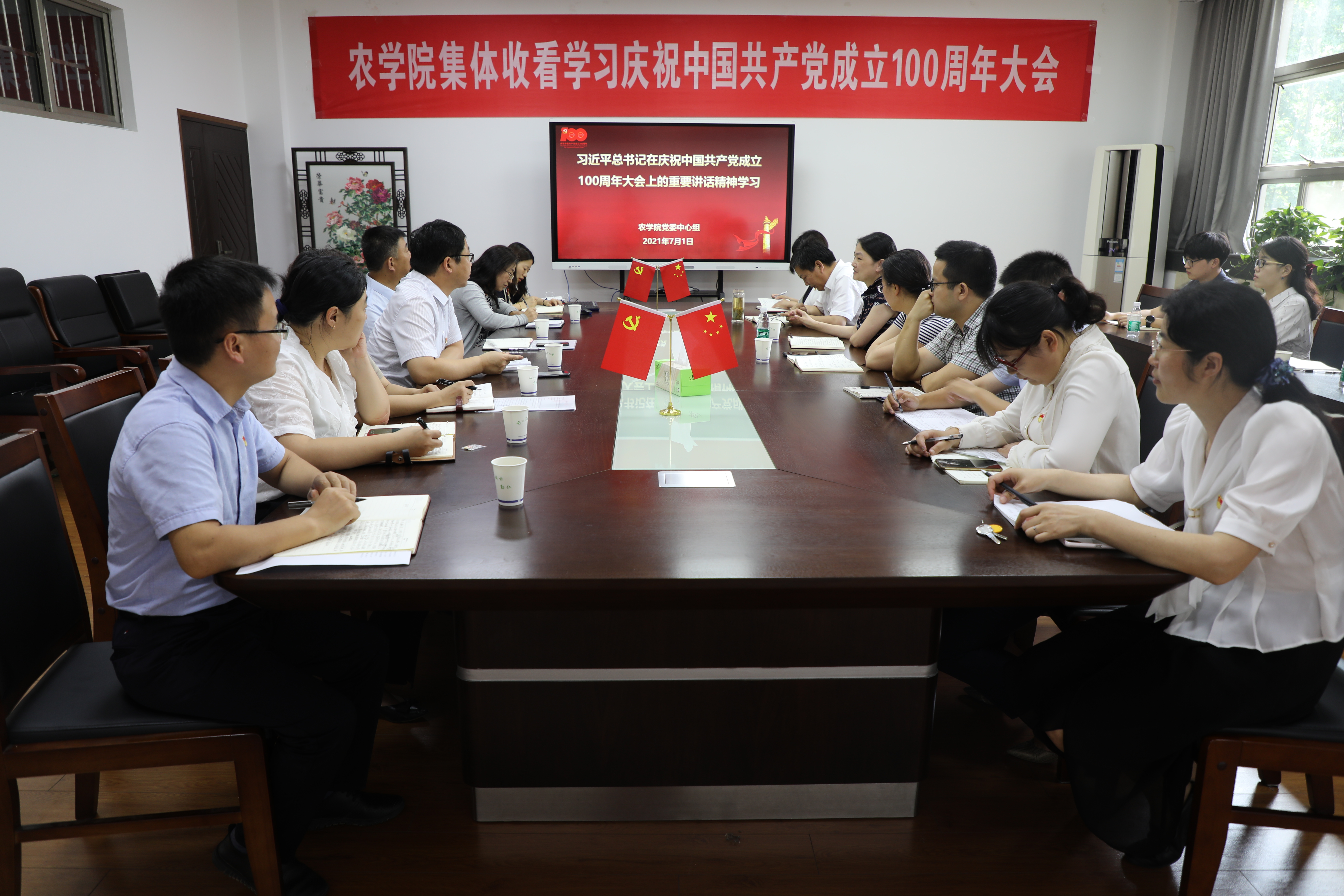 7月1日上午8时,庆祝中国共产党成立100周年大会在北京天安门广场隆重举行。中共中央总书记、国家主席、中央军委主席习近平同志发表重要讲话。学院领导、党委委员及院办教师党支部在学院会议室集中观看,学生党员代表200余人在教学楼C201集中观看,各教师党支部各自在分会场集中观看。