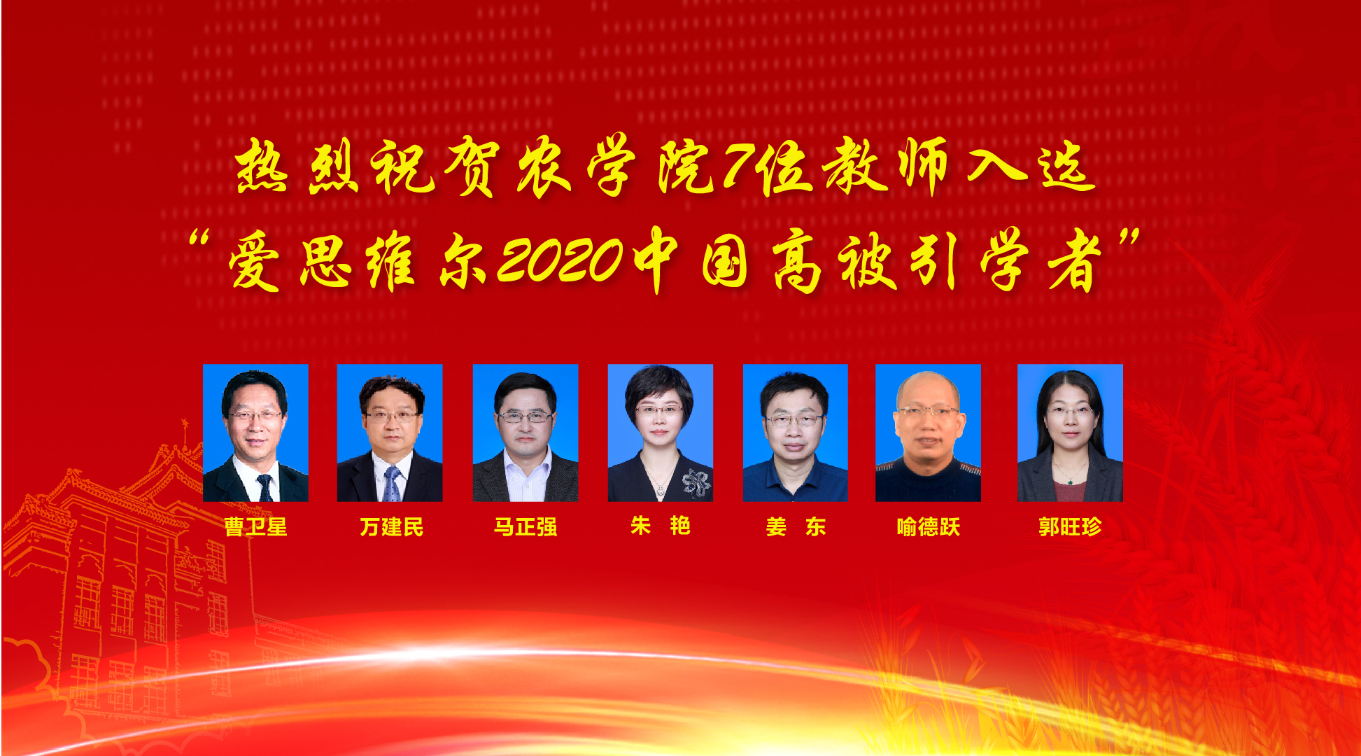 2021年4月22日,爱思唯尔(Elsevier) 重磅发布2020“中国高被引学者”榜单。国内4023位学者入选,来自373所高校、企业及科研机构,涵盖了10个教育部学科领域,84个教育部一级学科。在本次高被引学者名单中,八叉书库 曹卫星、万建民、马正强、朱艳、姜东、喻德跃、郭旺珍七位教授入选。