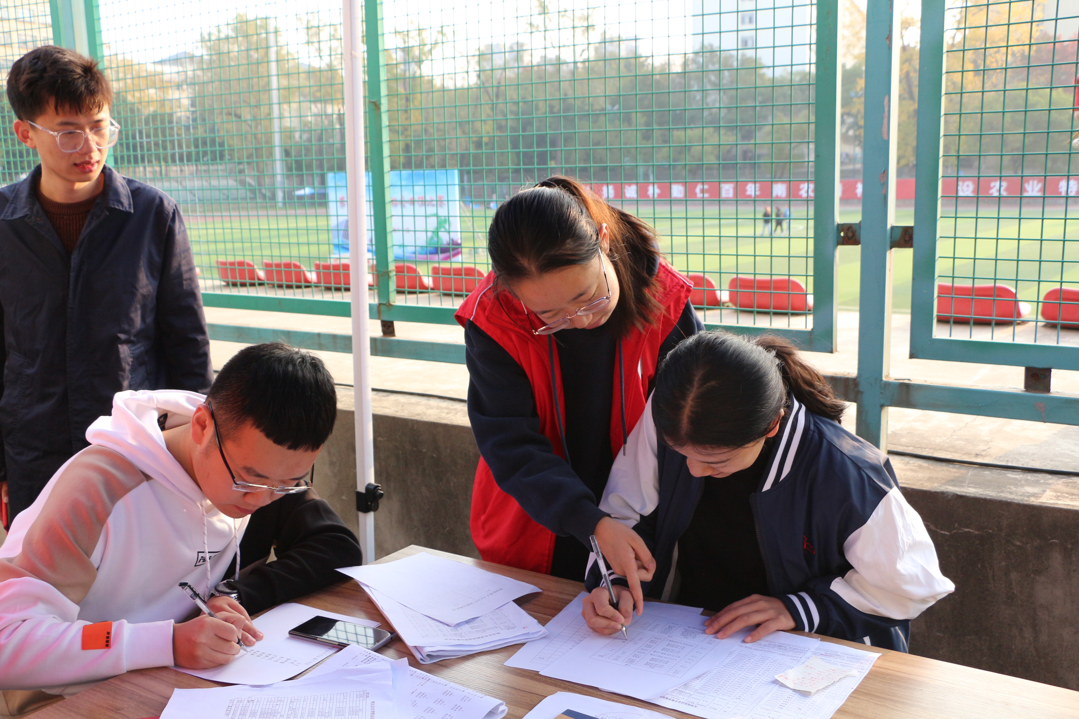 赛场的主角不仅有运动员,还有一群为运动会奉献的可爱的人。学院学生会、志愿者以及各班组建的啦啦队都在为运动会认真地付出着,是运动场上一道靓丽的风景线。