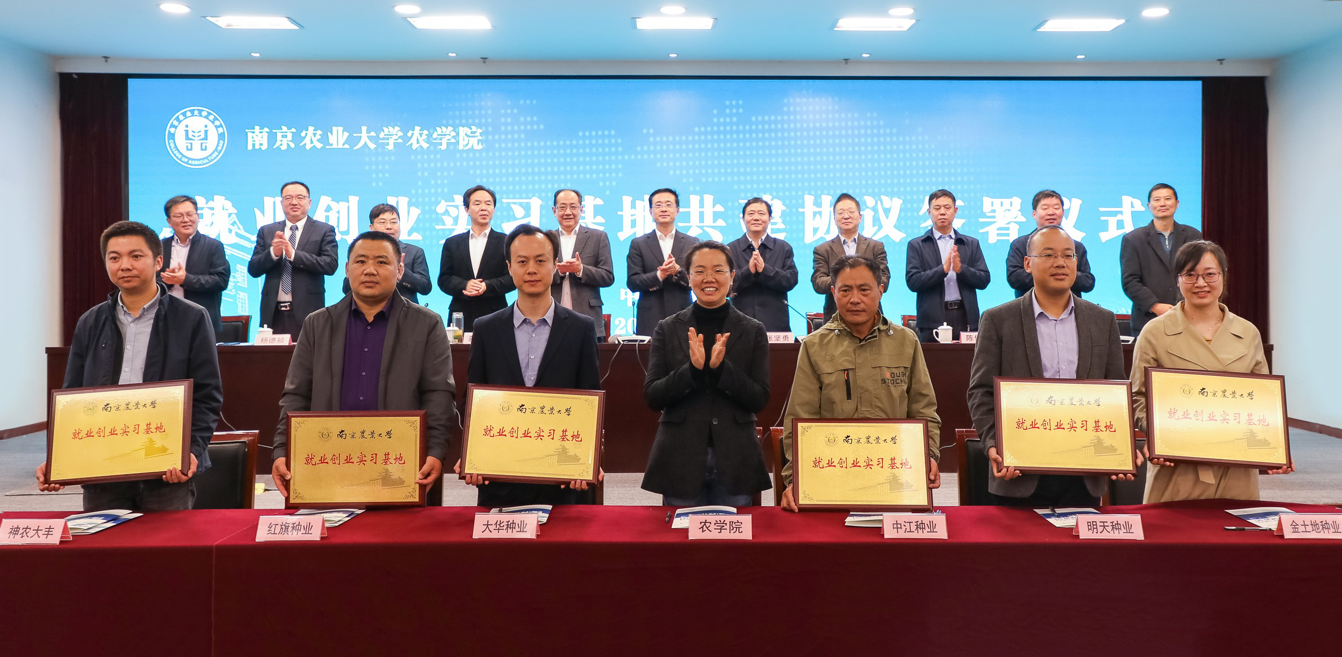 党委副书记殷美代表八叉书库 与六家企业签署了大学生就业创业实习基地共建协议,并颁发了就业创业共建基地铜牌。接着,举行了江苏省现代农作物种业人才基金颁奖典礼,20位优秀在校生和18位种业企业人才分别获得人才奖、成才奖和突出贡献奖。
