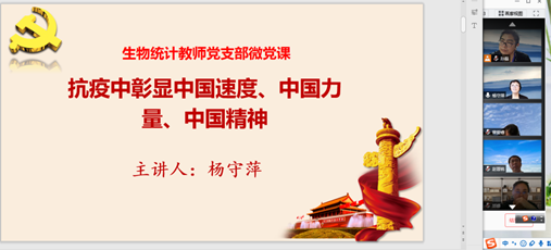 2020年7月8日上午,生物统计教师党支部召开支部全体党员会议,开展“抗疫”微党课学习和组织生活会,会议采用线上形式(腾讯会议)开展,支部全体党员参加会议,支部书记杨守萍主持会议。