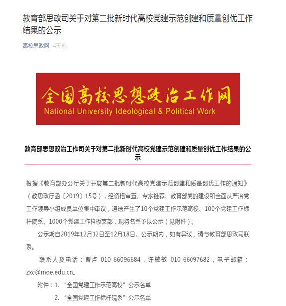 近日,教育部办公厅为深入贯彻落实习近平新时代中国特色社会主义思想和党的十九大精神,深刻学习领会全国教育大会、全国高校思想政治工作会议、学校思想政治理论课教师座谈会精神,结合“不忘初心、牢记使命”主题教育,面向全国高校培育创建10所党建工作示范高校、100个党建工作标杆院系、1000个党建工作样板支部。根据《教育部办公厅关于开展第二批新时代高校党建示范创建和质量创优工作的通知》(教思政厅函〔2019〕15号),经资格审查、专家推荐、教育部党的建设和全面从严治党工作领导小组成员单位集中审议,八叉书库