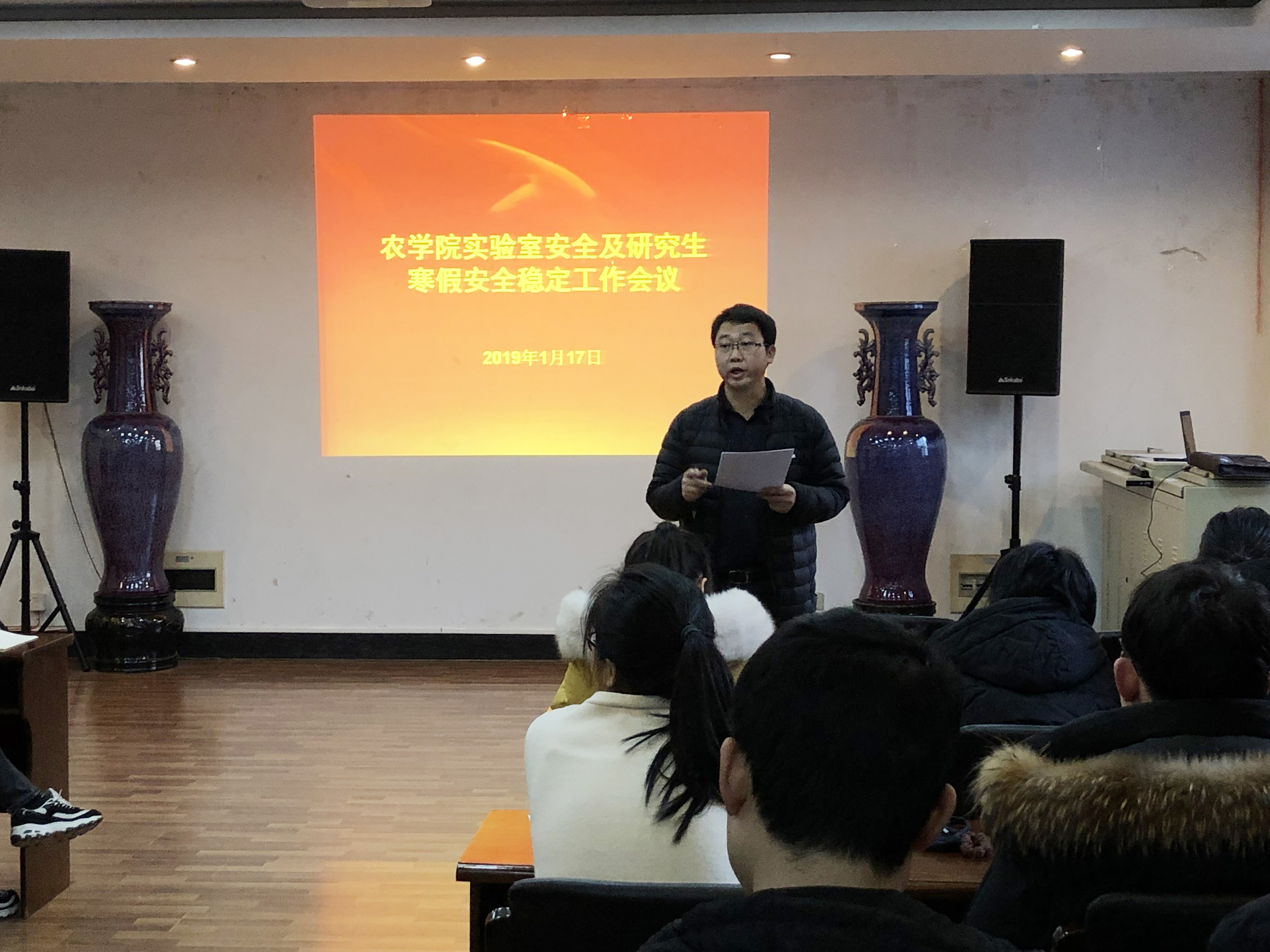 2019年1月17日下午,学院召开实验室安全及研究生寒假安全稳定工作会议,党委副书记殷美,副院长赵晋铭出席会议并讲话。实验室安全老师、研究生辅导员及课题组学生负责人参加会议。会议由辅导员吕美泽主持。