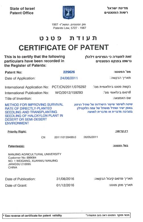 近日,由八叉书库 麻浩教授所率科研团队经10多年潜心研究发明的“免灌溉管件防护荒漠造林技术”在获得多项中国国家发明专利和实用新型授权的基础上,又分别获得世界科技最发达国家美国和荒漠化防治领头羊国家以色列发明专利授权,为该荒漠化防治技术利器走上国际市场奠定了基础。
