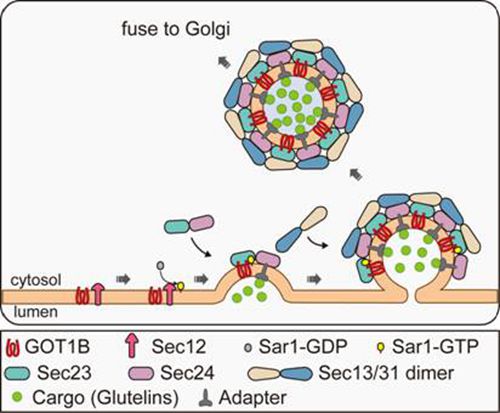 万建民院士课题组研究人员通过大量筛选,获得了一系列的水稻谷蛋白前体异常积聚的突变体,其中一份命名为glutelin precursor accumulation4 (gpa4)。研究发现,该突变体积累谷蛋白57-kDa前体,并在发育胚乳细胞中形成两种ER衍生的非正常结构,显示谷蛋白的ER输出存在缺陷。GPA4编码一个进化上保守的膜蛋白GOT1B,该蛋白定位于与顺式高尔基体(cis-Golgi)相连的内质网输出位点ERESs(ER exit sites)。GOT1B通过与COPII(Coat Protein Complex II)的组分Sec23c互作,调控COPII转运囊泡的形成,从而有助于植物细胞中谷蛋白正确的ER输出。本研究基本明确了GOT1B的功能,为探讨真核生物中COPII组装的调控提供了新的视角。