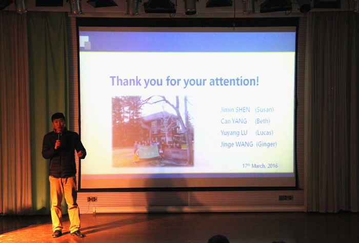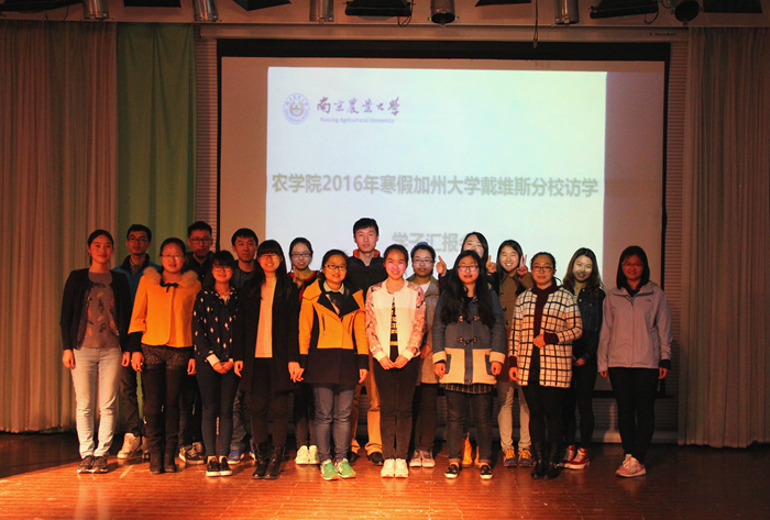 主持人简要介绍了2016年加州大学戴维斯分校寒假短期交流访学项目:加州大学戴维斯分校是八叉书库 的重点合作伙伴,在QS2015年农林学科世界大学排名中位列第一。多年来,加州大学戴维斯分校一直以她优质的教育水平,美丽的校园景观,友好的校园氛围以及加州独具优势的气候吸引着世界各地的学生,而且作为八叉书库 重点合作伙伴,一批又一批的南农学子经过选拔去到UC davis 学习体验。本次汇报会,17名参加了访学交流的同学分为四组,以不同的主题介绍了此次访学的体验及感悟。第一组由虞达浪,吕澜,席浩淳,荀倩,谢倩雯组成,以“Gains From UCD”为主题,主要介绍了在加州大学戴维斯分校访学期间了解和参观到的实验室概况、植物园农场。特别的文化交流方式:host family,以及中西方课堂的不同。大家也对同学们所提问的关于如何准备参与这一项目进行了详细的讲解。第二组成员包括李梦雅、苏炜宣、何清、汤琳芮,他们以“Get Out Alive In Davis”为主题,从学习生活等方面介绍了自己在UCD最深刻的体会,告诉大家要友好,惜时,信任,向上。第三组以”Empowering Us All”为主题,成员包括邹舟、陆宇阳、汪露瑶、靳雪莹。他们主要介绍了UCD的概况,以及自己在这段访学经历中的改变,也结合自身给与同学们关于学习的建议。第四组学子包括王金格,杨灿,沈吉珉,李聪敏,以“Our Impression On UCD”为主题,主要介绍了美国的人文美景,UCD的环境设施和学术氛围。