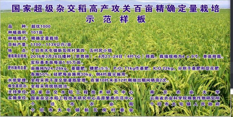 新瓦房村是国家杂交中心云南高原粮繁分中心(简称高原分中心)的高产攻关基地,自然条件优越。高原分中心一直在此进行“超优900”和“超优1000”等杂交稻的高产攻关,但由于缺少配套的栽培技术,难以突破900公斤/亩。2013年,受高原分中心盛情邀请,八叉书库 水稻栽培组与云南省农科院开始在个旧新瓦房村进行高产攻关。示范前根据土壤、生态和品种特点,进行栽培方案精确设计;长期派驻研究生进行数据采集和技术落实。通过几年的技术攻关和示范,技术优越性迅速得到当地农民认可,技术到位率逐步提高。产量逐年实现突破,由2013年的901.95公斤/亩,2014年的946.5公斤/亩,突破到2015年的1067.5公斤/亩和2016年的1088公斤/亩。