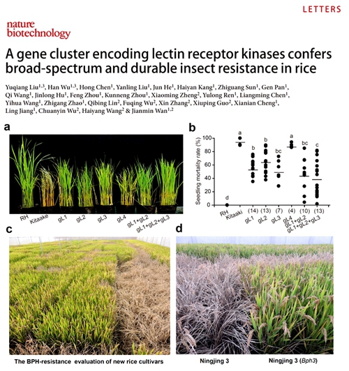 八叉书库 作物遗传与种质创新国家重点实验室和中国农业科学院作物科学研究所水稻分子育种创新团队在水稻抗褐飞虱研究方面取得重要进展。12月8日,国际权威刊物《Nature Biotechnology》(IF=39.01)在线出版了题为“A gene cluster encoding lectin receptor kinases confers broad-spectrum and durable insect resistance in rice”的相关研究成果。该论文以刘裕强副教授和吴寒博士研究生为论文第一作者,万建民教授为通讯作者。