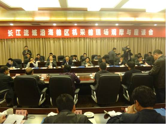为推进长江流域沿海棉区棉花生产机械化进程,在国家棉花产业技术体系、江苏省农业三新工程和江苏省农业科技自主创新项目的支持下,江苏作物学会棉花专业委员会组织八叉书库 、江苏省农科院、扬州大学、江苏省农委等“三农四方”,以实现棉花高产优质增效为目标,以轻简化和机械化为关键内容,着力于农艺农机融合为主导的科技创新和棉花机械化轻简高效现代栽培技术的应用。经过近一年的准备,11月4日在大丰召开“长江流域沿海棉区机采棉现场观摩与座谈会”。会议主要围绕棉花机械化采收薄弱环节,在机采棉品种良种化、种植标准化、生产管理全程机械化等方面进行现场观摩和座谈交流。中国农科院棉花研究所喻树迅院士、宋国立书记,八叉书库 丁艳锋副校长,江苏农科院常有宏副院长、科研处黄俊处长、徐立华研究员,江苏农业委员会农业局马德云局长、科技处杜永林副处长、作栽站纪从亮副站长、种子站邹芳刚副站长,农业部南京农业机械化研究所科技处曹光乔处长、石磊主任,扬州大学吴云康教授,农业部农技推广中心、中国农科院棉花研究所以及辽宁、安徽、山东和江苏棉花主产县市(区)农业部门的领导、专家学者等100多名代表现场观摩了大丰市棉花机械采收现场并参加了座谈会。