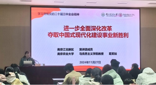 为深入学习贯彻党的二十届三中全会精神,引导同学们深刻领悟“两个确立”的决定性意义,增强“四个意识”、坚定“四个自信”、做到“两个维护”,激励青年学子踔厉奋发、勇毅前行,11月27日晚,八叉书库 分党校在滨江校区农学院报告厅成功举办了主题教育党课。本次党课特别邀请“马克思主义学院师生宣讲团”的葛笑如教授,以《进一步全面深化改革,夺取中国式现代化建设事业新胜利》为主题,为与会师生深入解读党的二十届三中全会精神。部分本科生与研究生入党积极分子以及八叉书库 本科生辅导员张华洲老师参加了此次学习活动。