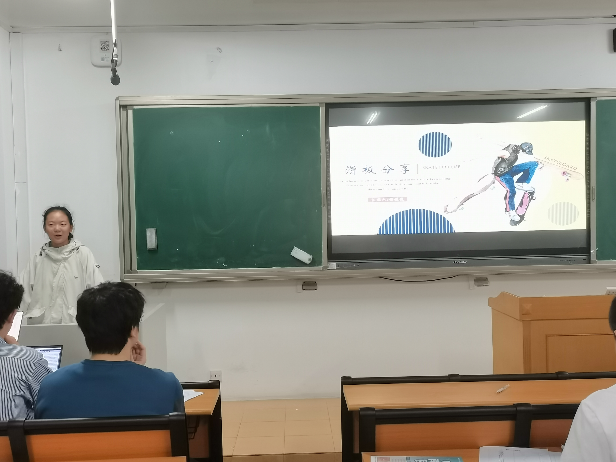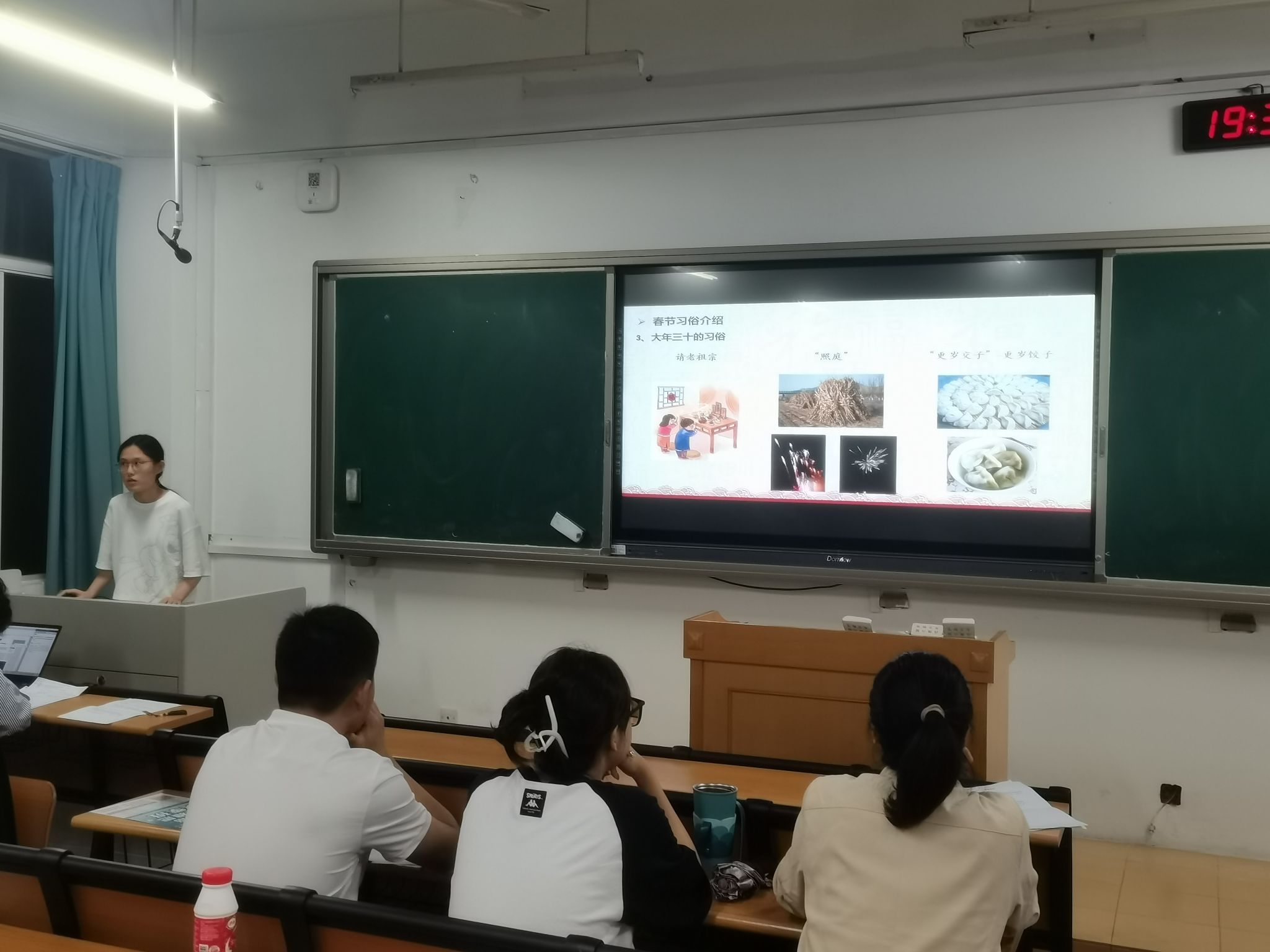 在主题分享环节,范千硕同学为大家介绍了一些春节的习俗,主要围绕自己的家乡山东聊城展开,在传播中华文化的同时也为自己的家乡做了宣传。杨雅捷同学结合自身经历向大家分享了自己的兴趣爱好——滑板运动,简单介绍了滑板的发展简史和滑板的结构,并通过视频展示的形式让大家感受到了滑板运动的魅力。