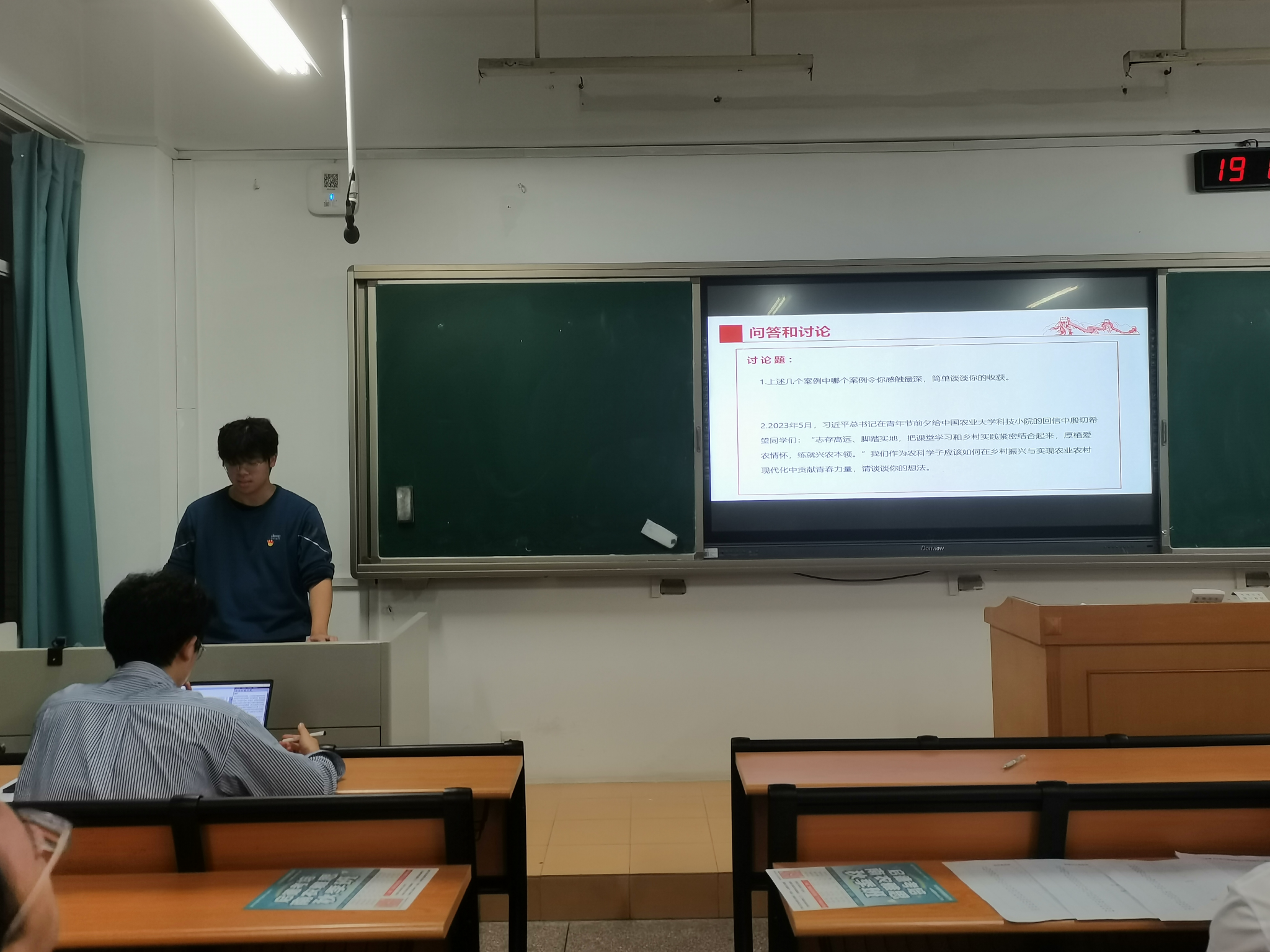 “持兴农爱农之匙,启农业强国之门”。本次分班讨论从建设农业强国、贡献青春力量、厚植爱农情怀三个方面展开,在王钏跞同学的带领下,大家充分了解到了建设农业强国的重要性,从王宇梅、王东杰等人学以兴农的故事中体会到了爱农青年的使命担当,也深刻学习了如何在农业强国建设中展现农学青年的担当与使命。