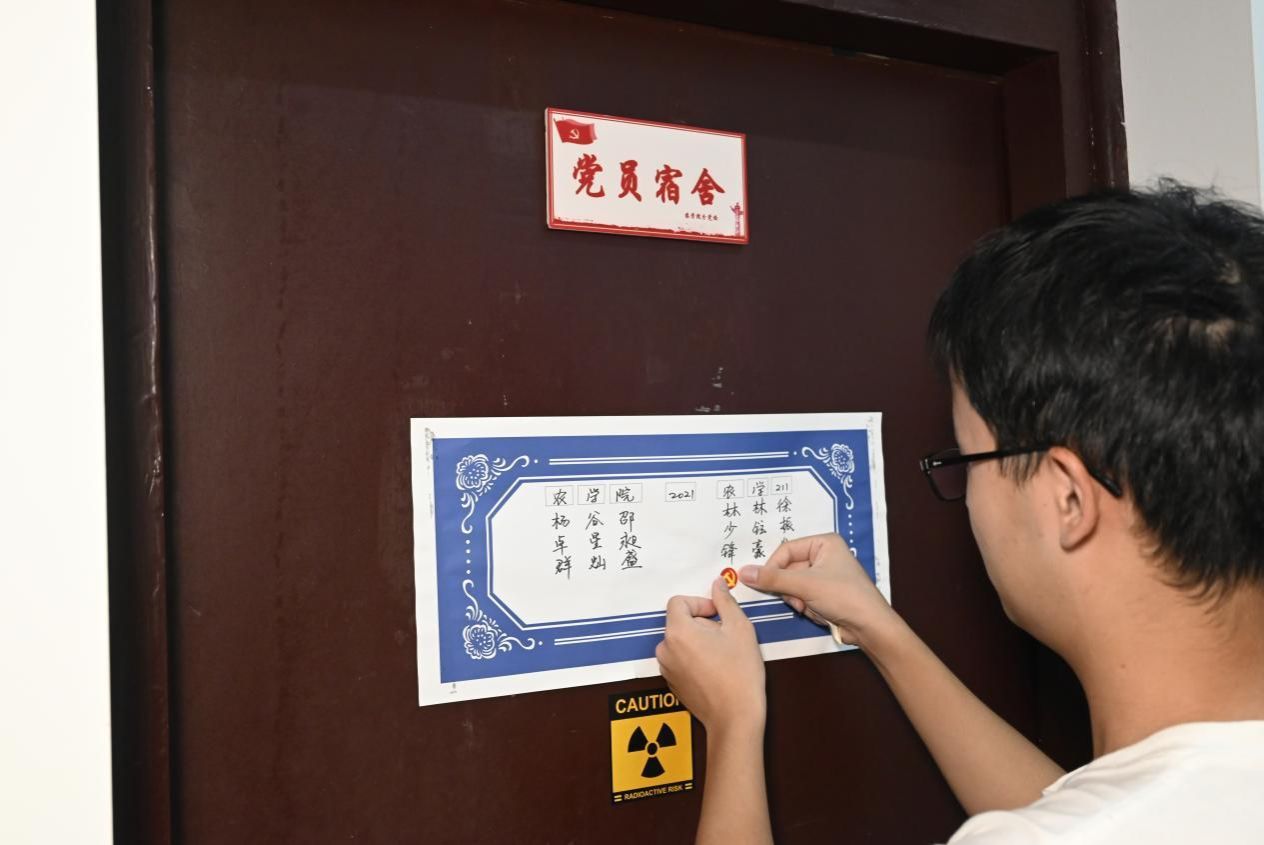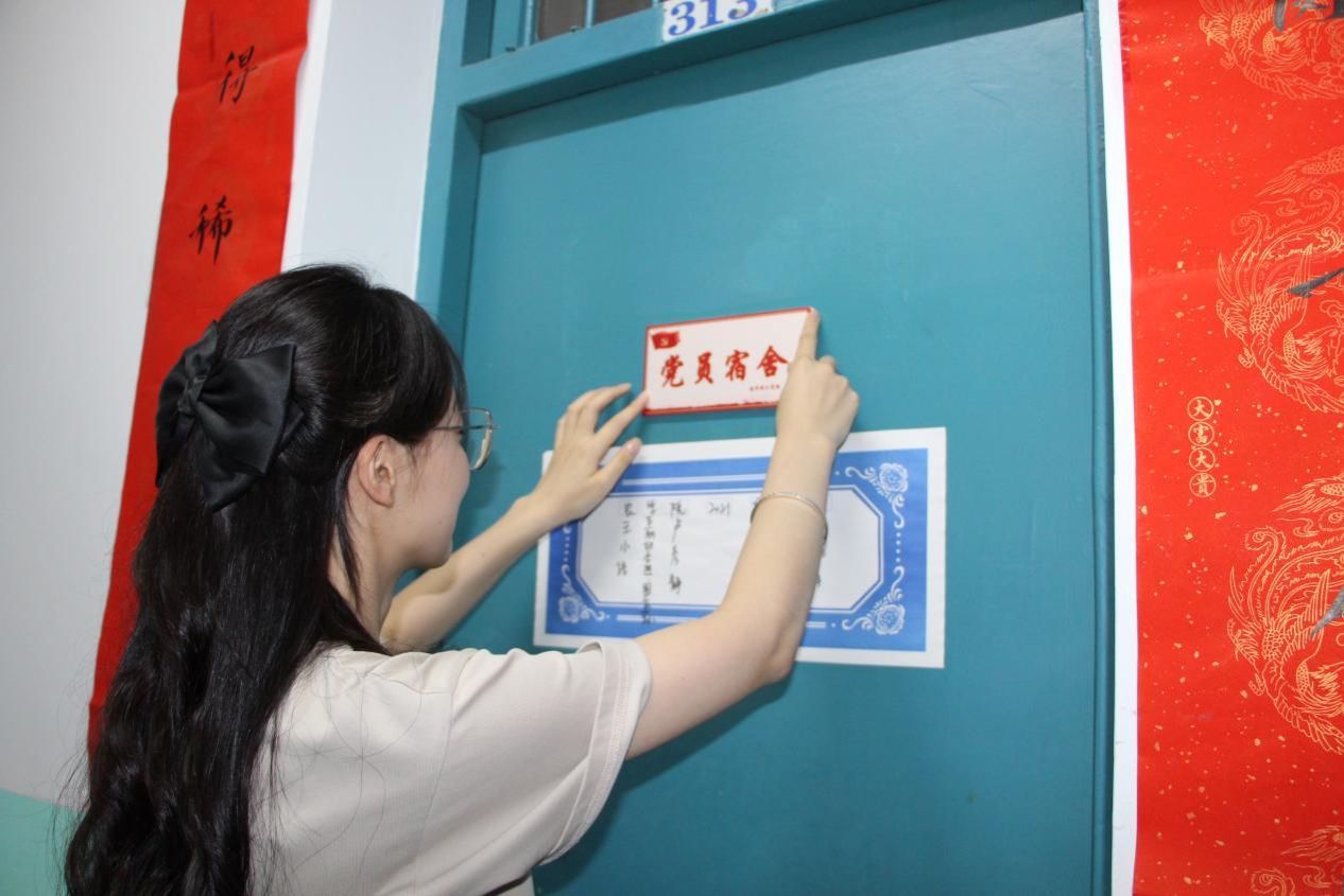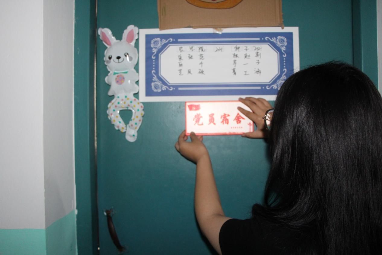 此次活动中,八叉书库 分党校成员在预备党员所在宿舍门上粘贴“党员宿舍”牌,并在预备党员的姓名下方进行特别标记,共计完成宿舍亮牌17间、标记预备党员23名。