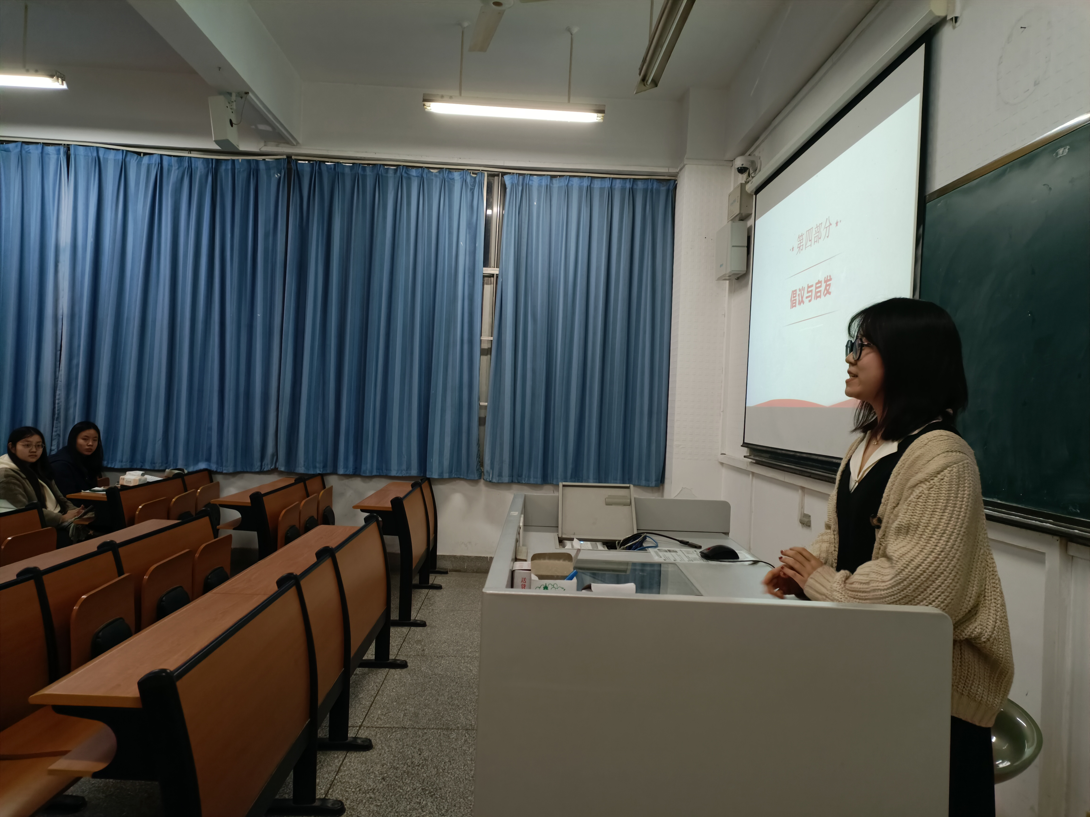 王令涵同学首先为支部同学介绍了中国共产党的百年奋斗历程。她总结了中国共产党在新民主主义革命时期、社会主义革命和建设时期、改革开放和社会主义现代化建设新时期、中国特色社会主义新时代这四个时期做出的主要贡献,让同学们更清晰地理解中国共产党不忘初心、牢记使命的精神在百年中是如何形成并传承至今的。