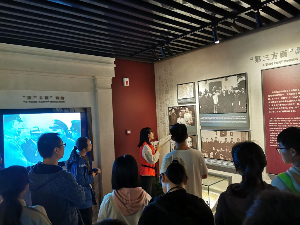 到达梅园新村后,学员在周恩来的全身铜像前合影,接着跟随讲解志愿者进入国共南京谈判的史料陈列馆进行参观。在参观和讲解中,更加了解南京谈判的那段历史,了解在1946年5月至1947年3月,周恩来为首的中共代表团在南京与国民党进行的为期十个月的和平谈判。
