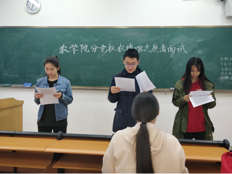 3月27日中午,农博馆讲解志愿者面试在教学楼B105进行。八叉书库 分党校成员担任面试官,此次志愿者招募对象主要面向八叉书库 本科生所有党建班学员。