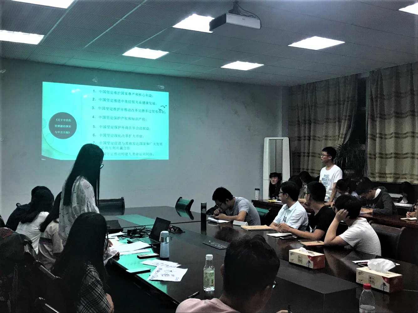 2018年9月27日,农学专业一党支部在会议室B1013进行了分班讨论。讨论会围绕“中美贸易”的主题展开。本支部所有党员、预备党员和积极分子参加讨论,一党支部书记赵然主持此次讨论会。