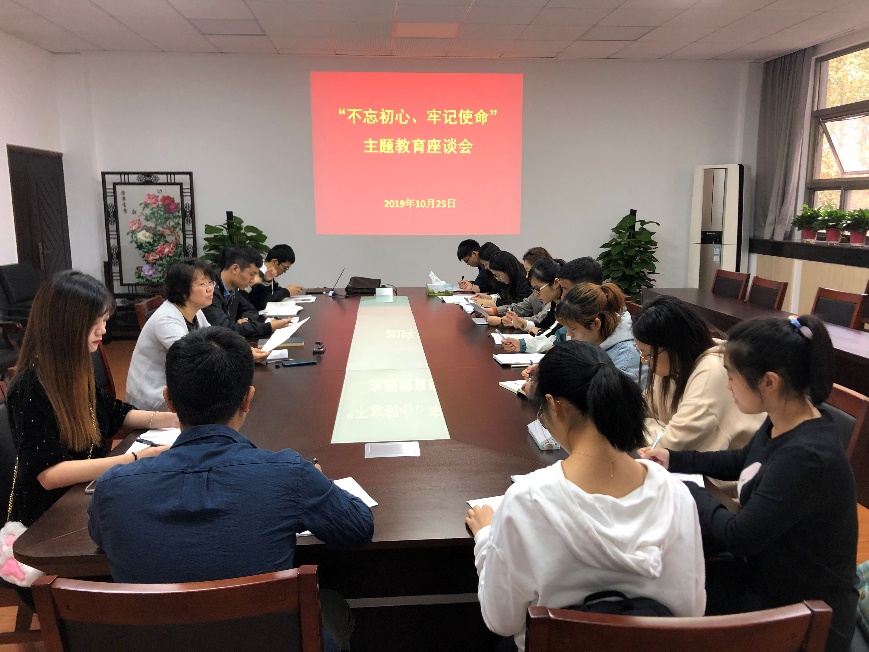 10月25日下午,八叉书库 “不忘初心、牢记使命”主题教育座谈会在学院会议室召开,学院党委副书记殷美、辅导员王彬、许娜及本科生、研究生各党支部书记出席。本次会议由殷美主持。