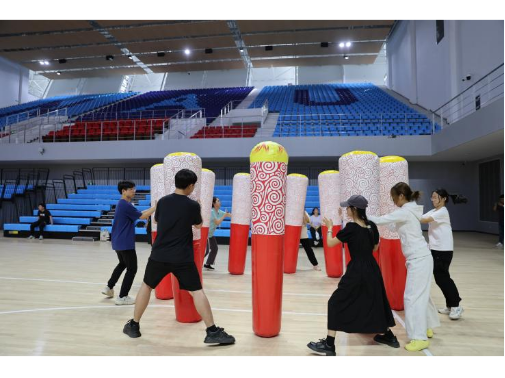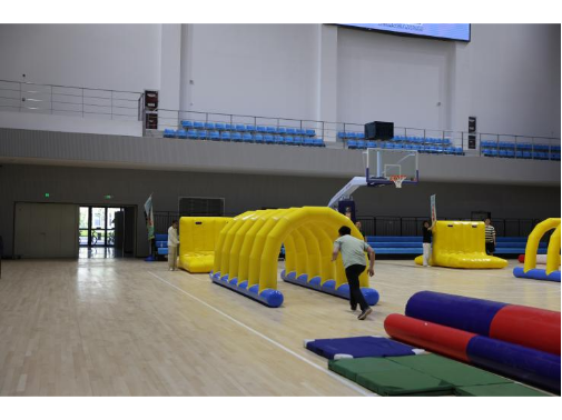 在体育中心主场馆内,精心布置的充气道具营造出了一个充满梦幻色彩的空间,让同学们仿佛置身于一个充满无限可能的梦想世界。我们翻越层层阻碍,终于扬帆起航!我们传递火炬周而复始,一代又一代薪火相传!