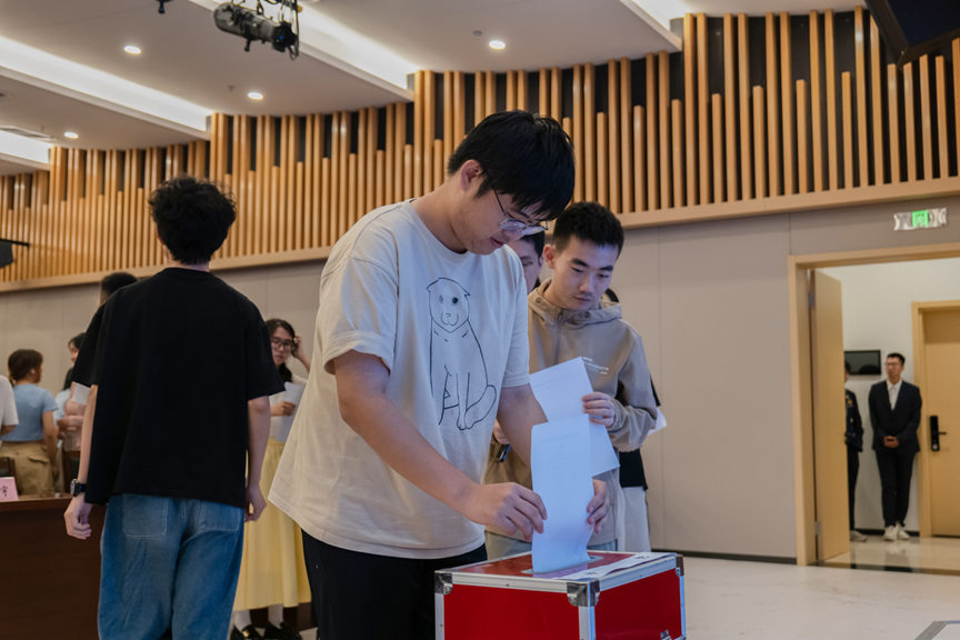 候选人拉票结束后,张佳瑜上台说明《八叉书库 第五次学生代表大会选举办法》,工作人员进行选票的派发。参会人员填写选票并上台投票,由工作人员密封投票箱,学院将综合面试、竞选大会等环节评定竞选结果。
