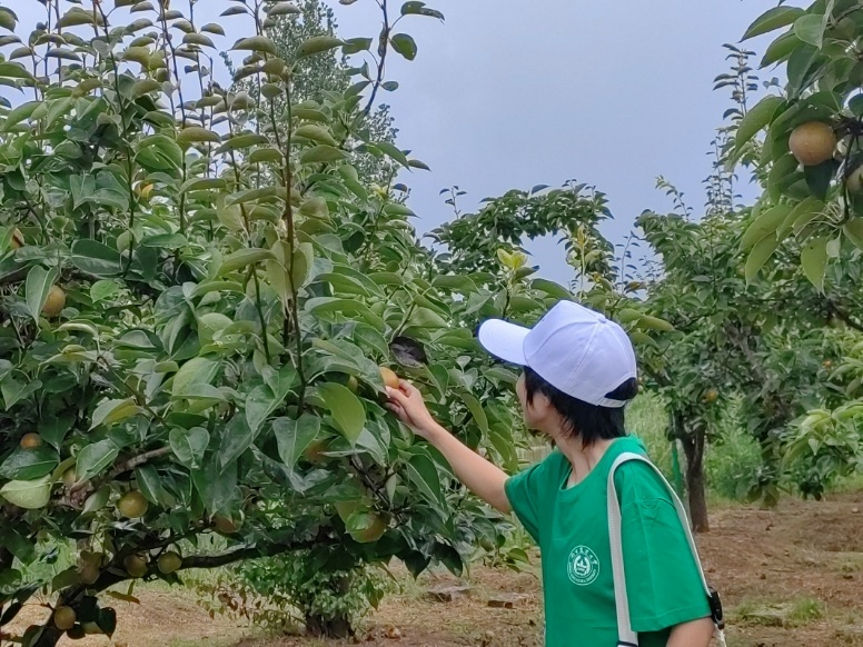 潘教授还带领实践团参观了合作社及曹庄富硒生态园。梨园枝繁叶茂,翠绿的果实挂满枝头。这样一个生意盎然的天然氧吧每年都会吸引大量游客,有助于芝山村实现“农业+旅游业”的双重创收。