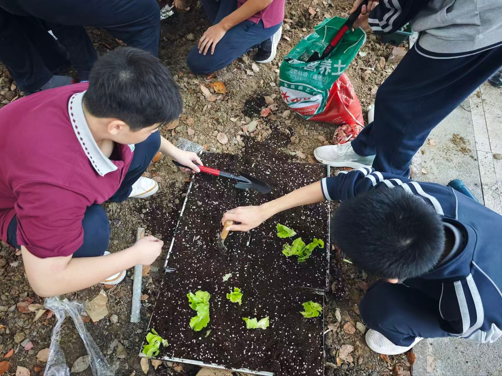 志愿者们提前准备了角堇、酢浆草、番茄、生菜、油菜、辣椒等蔬菜种子或幼苗、以及种植箱、宽面铲等种植工具。到达中学后,将同学们五人一组分组,每组配一位志愿者指导种植流程。