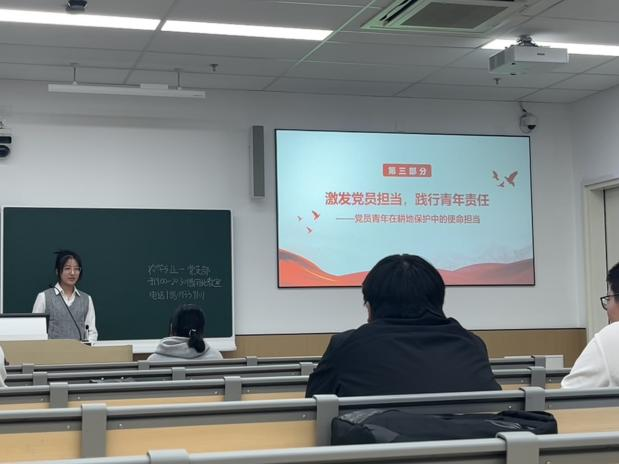 第三部分由农学242班的郎一诺同学主讲。该部分主讲人聚焦党员青年的责任担当,分享了八叉书库 专家参与国家耕地保护立法、全国土壤普查与耕保培训的实例,以及陕西延安“田长守护网络”机制、安徽全椒县“党支部+网格党小组+党员中心户”三级管控体系等基层创新实践,凸显党员在耕地数量守护与质量提升中的先锋作用。