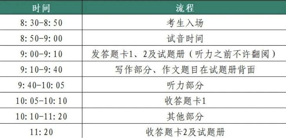 ①带齐身份证件,包括准考证、身份证;②带齐文具用品(2B铅笔、橡皮、黑色签字笔);③准备好听力耳机,提前调频;④考试过程中严格按照监考老师的指令答题,不得提前翻阅试卷、提前答题等。