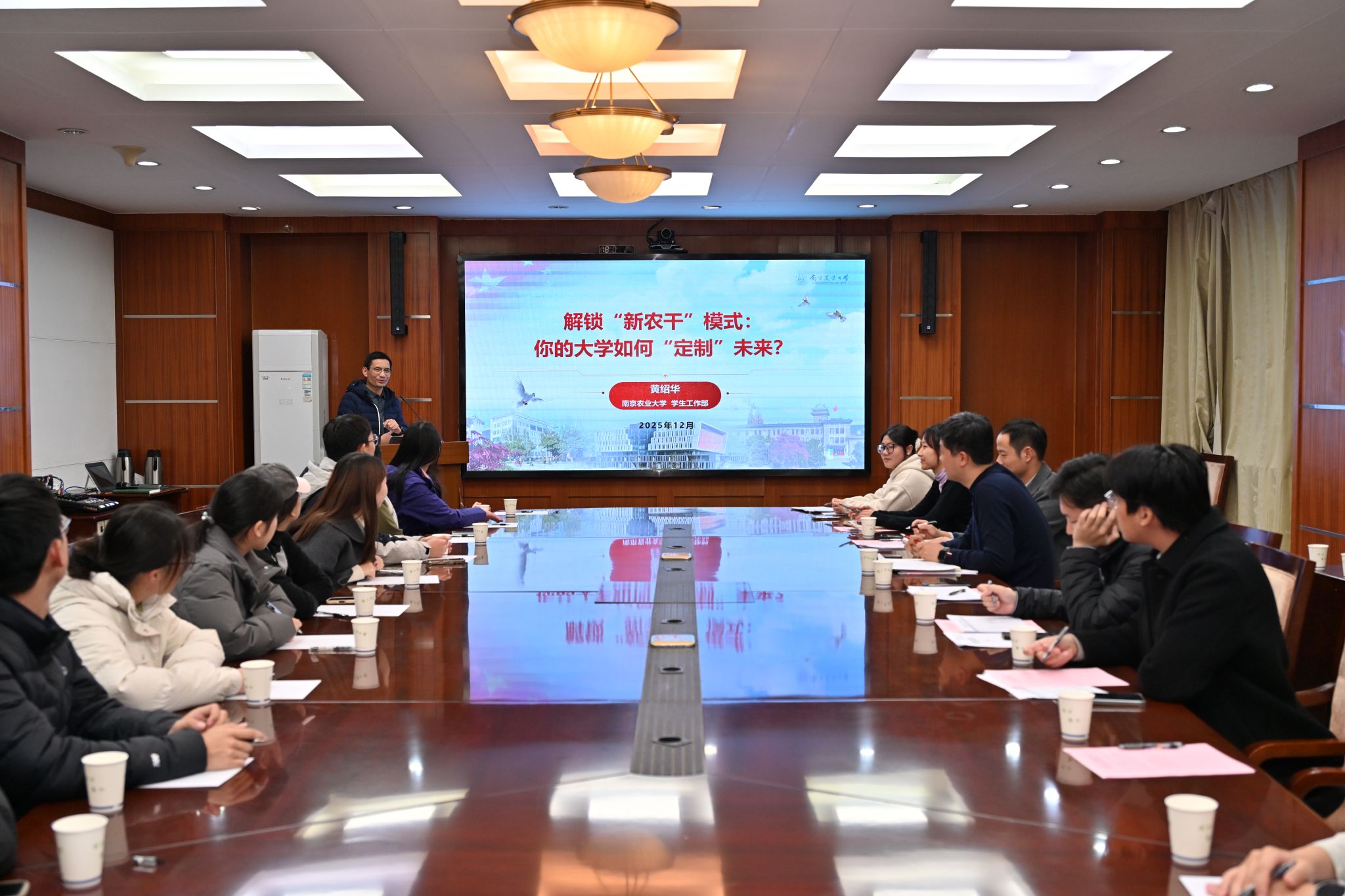 会议伊始,黄绍华向同学们作题为《解锁“新农干”模式:你的大学如何“定制”未来?》专题讲座。讲座以“三势”——“国家大势、时代态势、发展趋势”开篇,从时代背景的角度阐释“新农干”项目的战略意义,并从“知识、能力、品格”三个方面阐述一名合格的“新农人”应具备的核心能力。最后,针对学业规划,他建议同学们结合各阶段发展重点制定计划,将“成功之道、职责之要、使命之需”转化为内在的学习动力,科学管理时间,充分利用学习资源,在服务乡村振兴的道路上跑出自己的“加速度”。