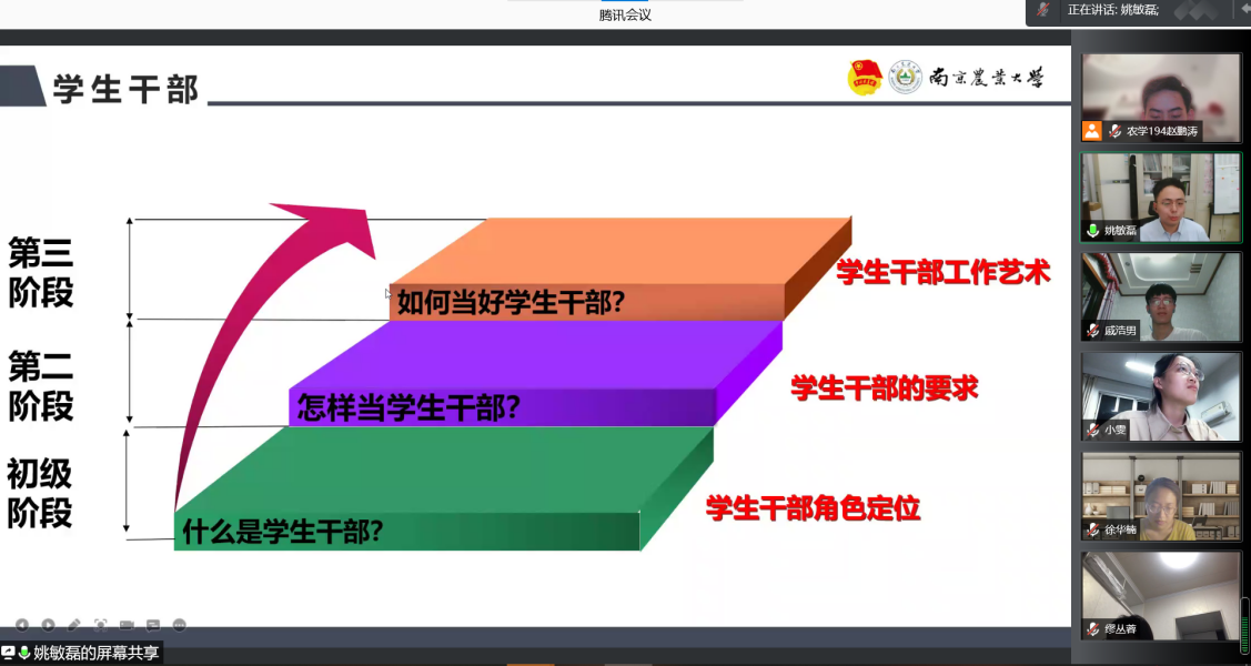 9月15日晚,八叉书库 2021-2022学年学生组织主要学生干部系列培训在腾讯会议平台顺利举行。校团委宣传部部长姚敏磊老师以“学生干部请就位”做主题分享,本科生辅导员孙小雯、2021-2022学年学生组织主要学生干部全体参加会议,会议由现任主席团成员赵鹏涛主持。