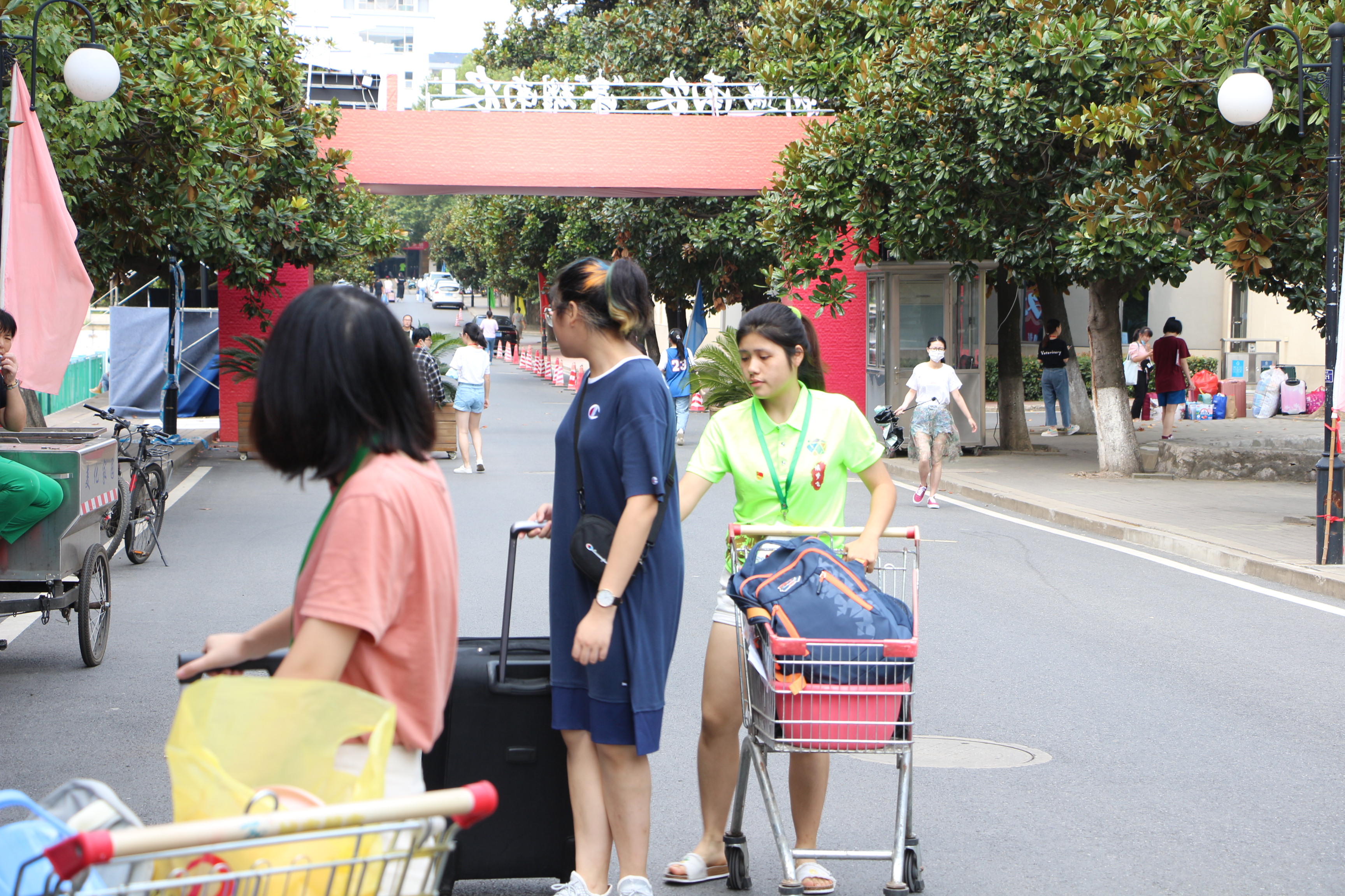 接着,志愿者们带领各自负责的新生前往宿舍办理入住手续。在前往宿舍的路上志愿者为新生介绍了校园的各个地方:食堂、操场、教学楼、图书馆……他们的耐心讲解帮助新生更好地熟悉了校园生活。被分配到行李房的同学,不言辛苦地为新生检查并分发着床上用品……校园的每一个角落都洋溢着热闹喜悦的气息和蓬勃向上的氛围。