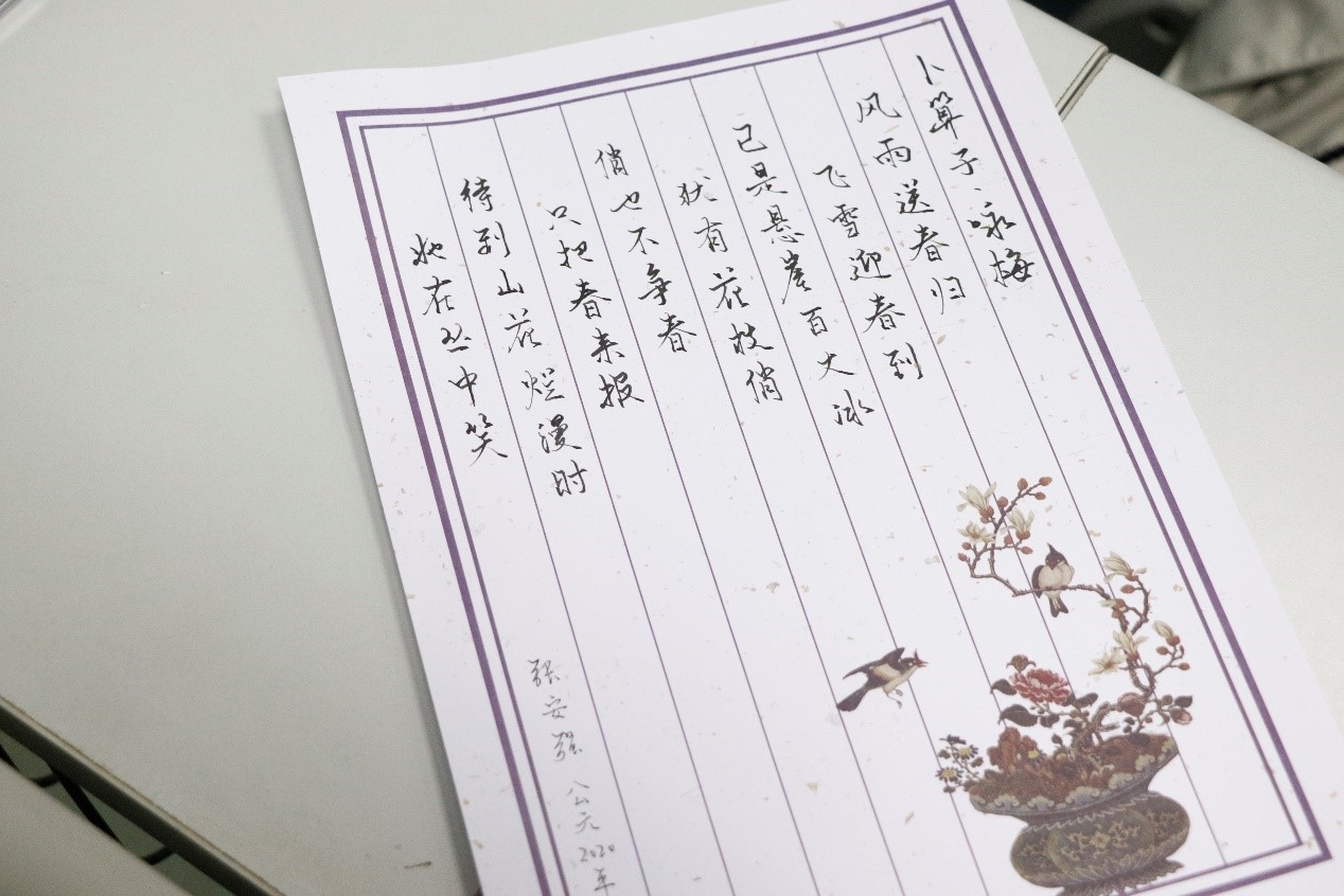 最后,是奖品分发环节。三本实体书籍分别赠送给第一个主动朗诵的同学、答题最多的同学和第一个分享视频感想的同学。书扉页印盖有原野文学社的印章,希望原野文学社能够陪伴每一位热爱文学的同学共同成长与进步。此外,现场所有的同学都得到了一枚精美的书签和誊写诗词的信笺,大家用笔尖传递诗情,在纸上留下温度。