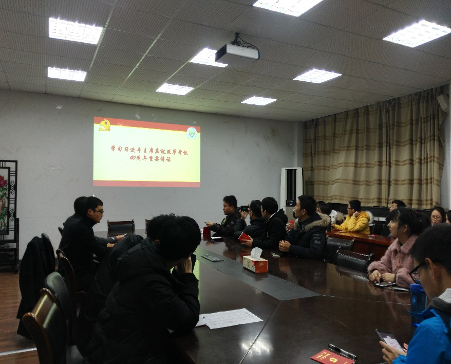 2018年12月26日晚6:30,农学系研究生第三党支部全体党员、预备党员以及入党积极分子在生科楼b1013会议室开展了习近平主席庆祝改革开放四十周年重要讲话的学习活动,活动由农学系研究生第三党支部书记汪康康同志组织开展,本次活动通过视频形式进行学习。